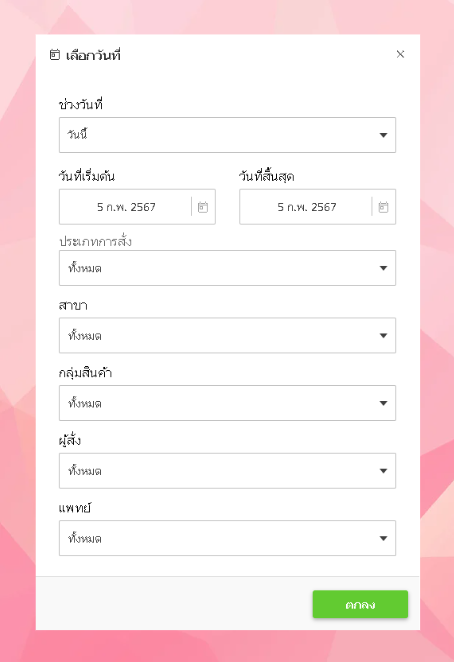 ช่วงวันที่ ผู้ใช้งานเลือกช่วงวันที่ หรือ กำหนดวันที่เอง : ระบบจะทำการค้นหาในช่วงวันที่ที่ผู้ใช้งานระบุ