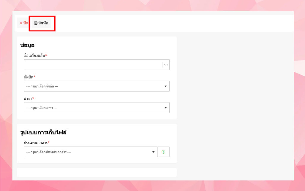 - ผู้ใช้งานทำการกรอกข้อมูล ชื่อเครื่องมือแล็บ ผู้ผลิต สาขา และรูปแบบการเก็บไฟล์