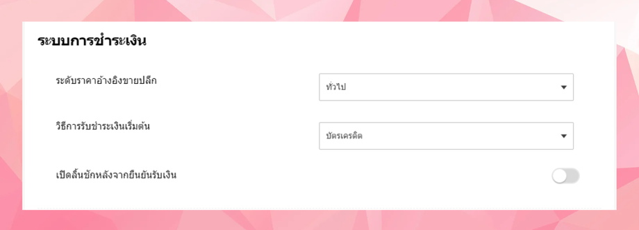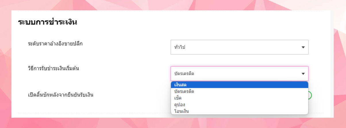 เลือก วิธีการรับชำระเงินเริ่มต้น บัตรเครดิต, เงินสด, เช็ค, คูปอง, โอนเงิน