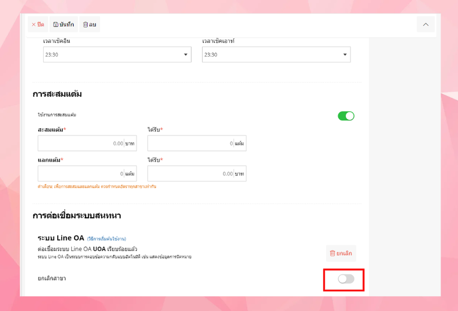 หากผู้ใช้งานต้องการยกเลิก > ด้านล่างจะเห็นหัวข้อยกเลิกสาขา สามารถเปิดปิดการยกเลิกสาขาได้ (หากยกเลิกแล้วระบบจะไม่ใช้งานข้อมูลที่ยกเลิกไป)