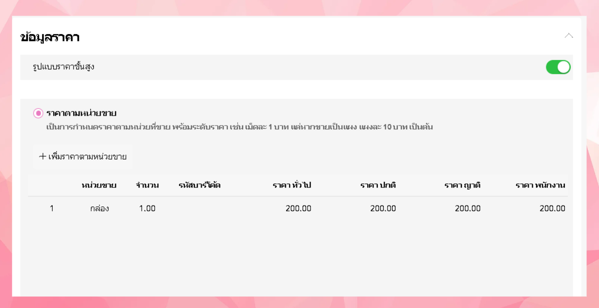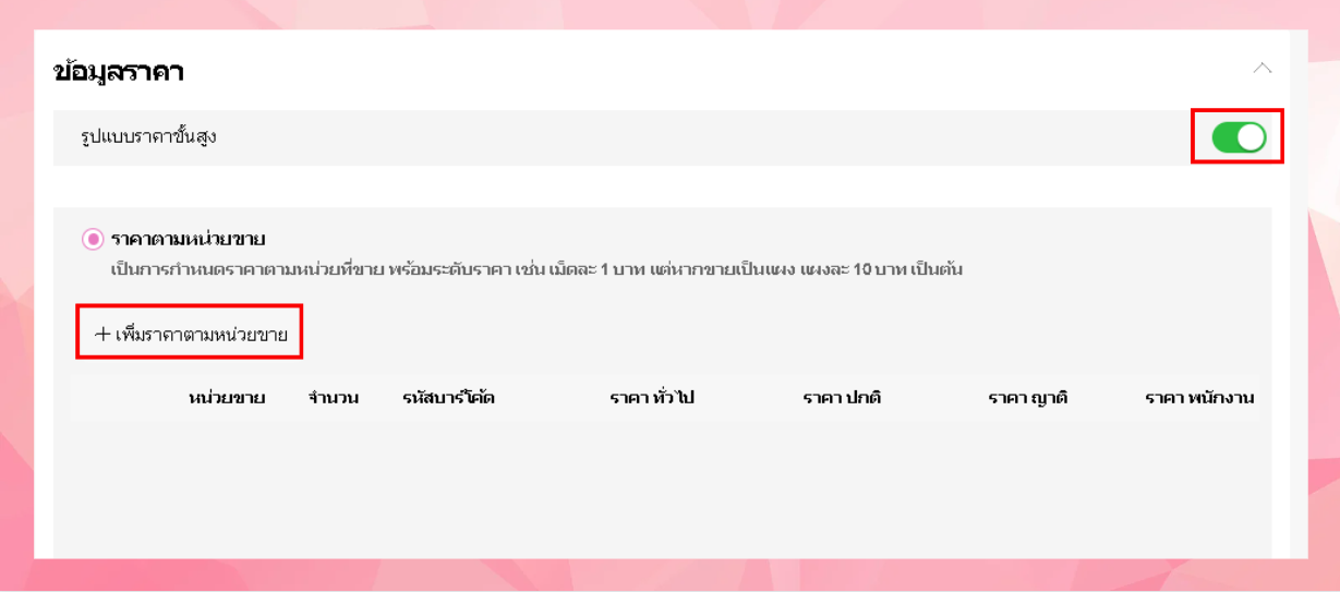 - สามารถตั้งราคาขั้นสูงได้โดยเปิด รูปแบบราคาขั้นสูง