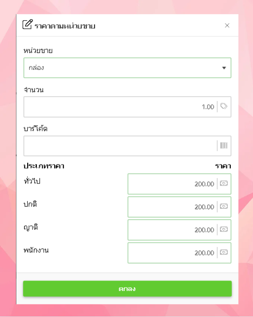 - ระบบจะแสดงหน้าต่างเพิ่มราคาตามหน่วยขาย ผู้ใช้งานระบุข้อมูลตามต้องการ
