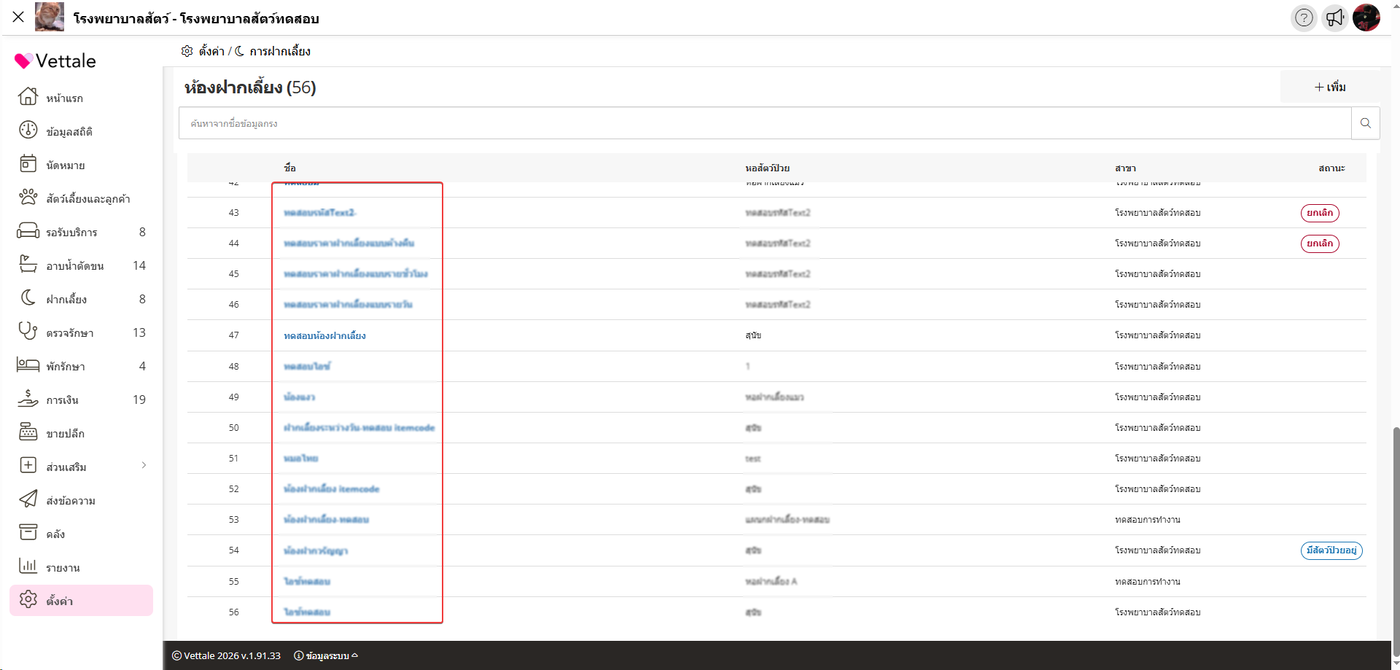 ใช้สำหรับกำหนดและแสดงรายการห้องฝากเลี้ยงที่มีอยู่ในแต่ละคลินิกหรือโรงพยาบาลสาขา โดยเชื่อมโยงข้อมูลจากแผนกฝากเลี้ยงของสาขานั้น เพื่อให้ระบบสามารถนำไปใช้ในการบริหารจัดการและให้บริการได้อย่างถูกต้อง