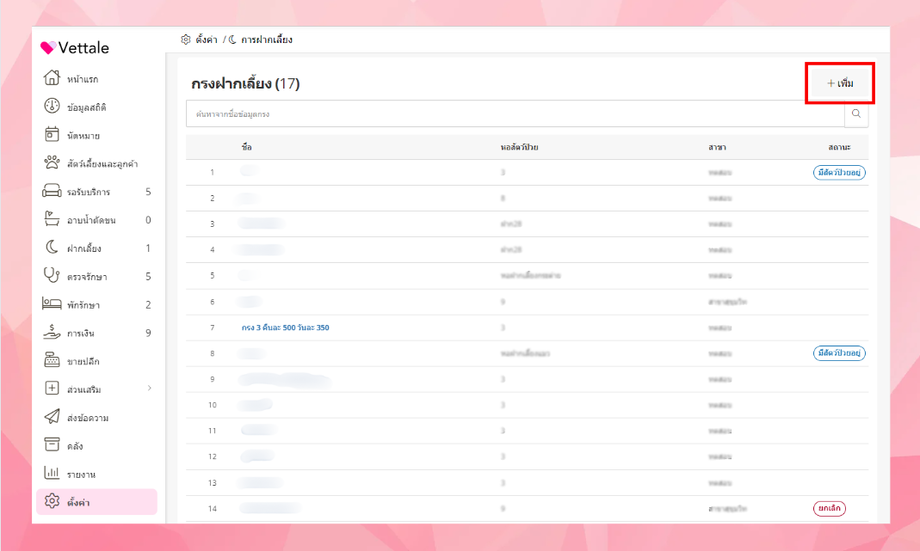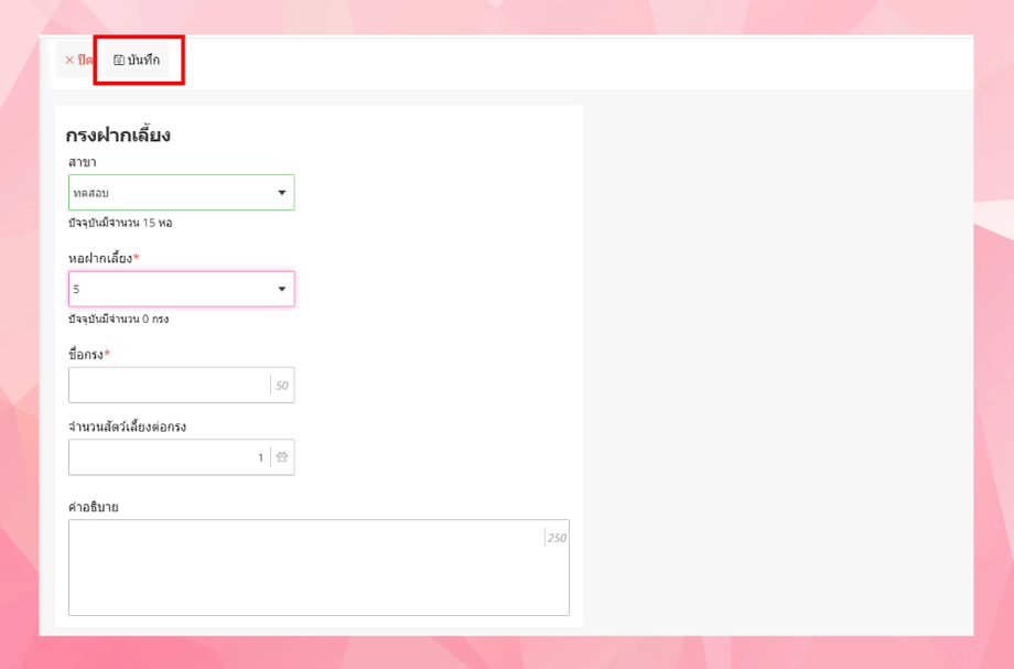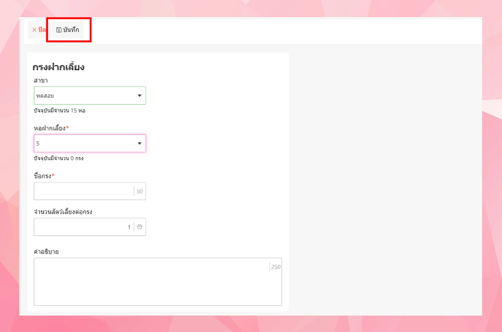 การตั้งค่าข้อมูลกรงฝากเลี้ยง เป็นการตั้งค่าเพื่อแสดงว่าภายในคลินิคหรือโรงพยาบาลสาขาใดมีกรงหอพักใดบ้าง โดยอ้างอิงจากหอฝากเลี้ยงของคลินิคหรือโรงพยาบาลนั้นๆ