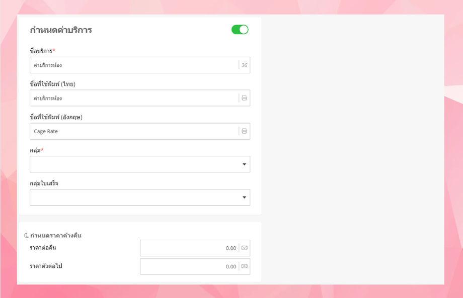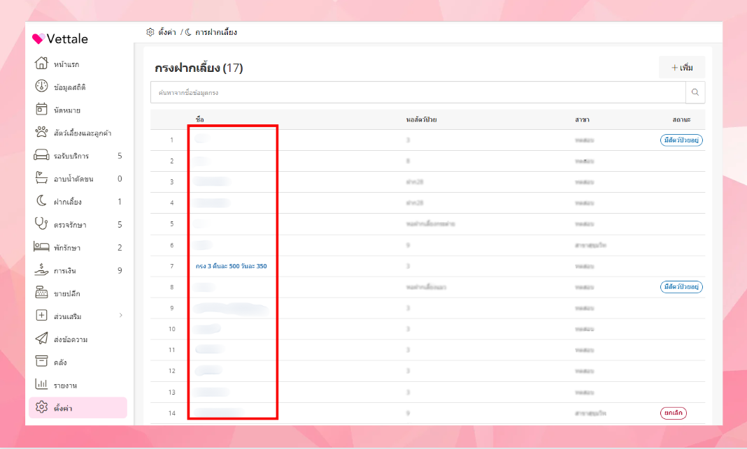 เมื่อผู้ใช้อยู่ในหน้ากรงฝากเลี้ยง ให้ผู้ใช้เลือกรายการที่ต้องการกำหนดค่าบริการฝากเลี้ยง