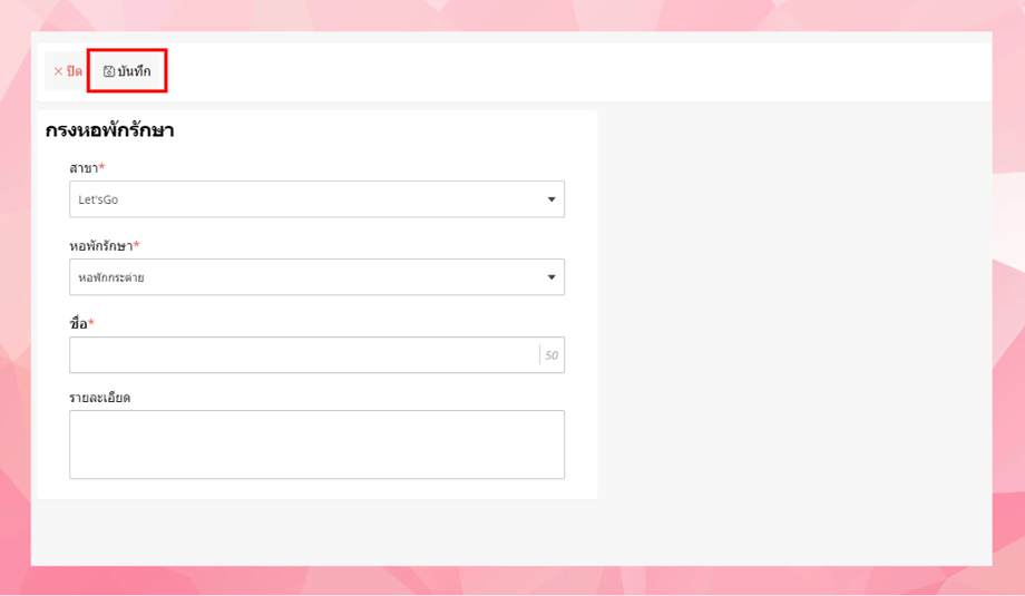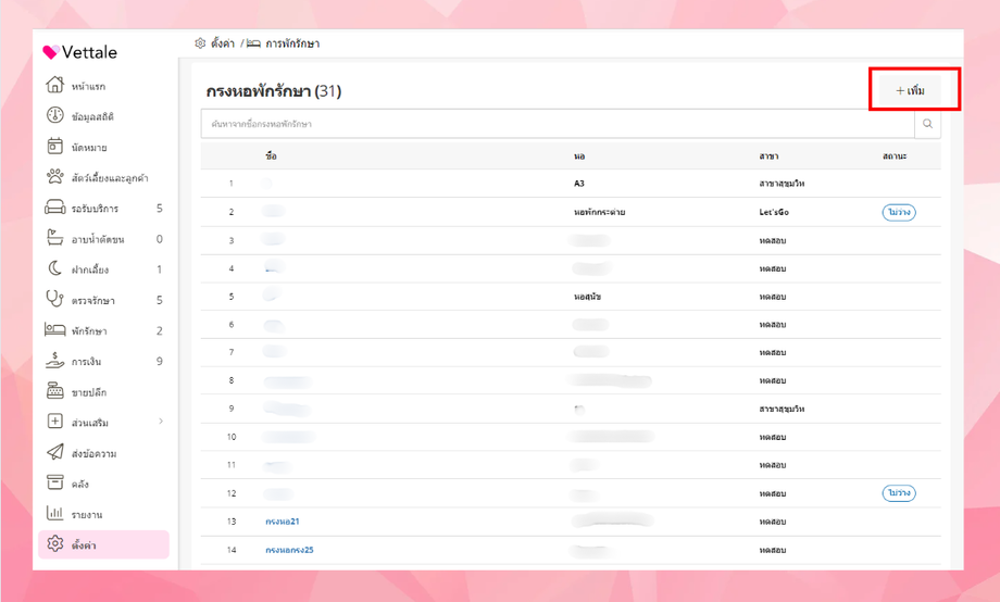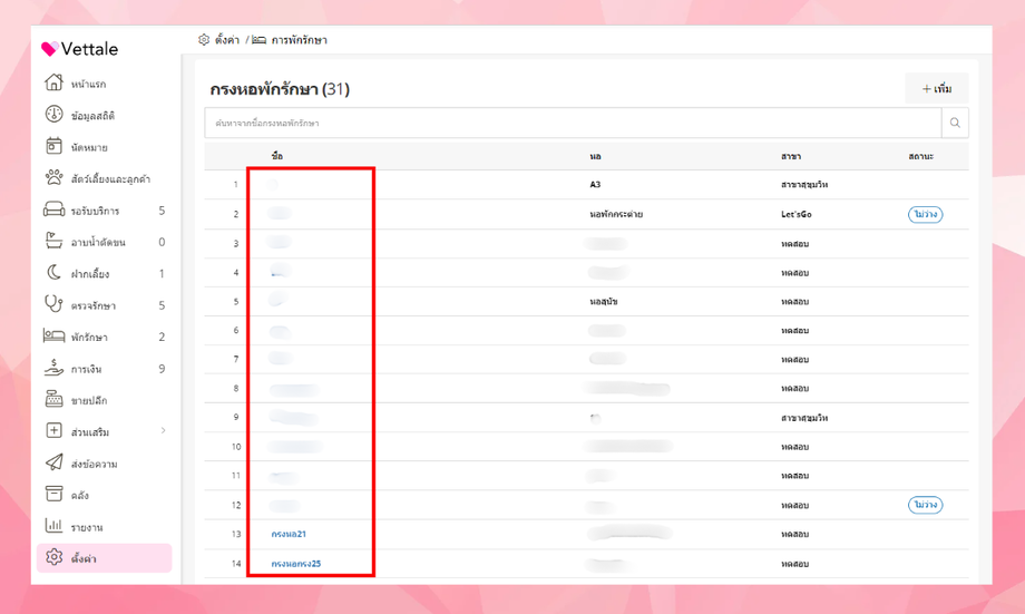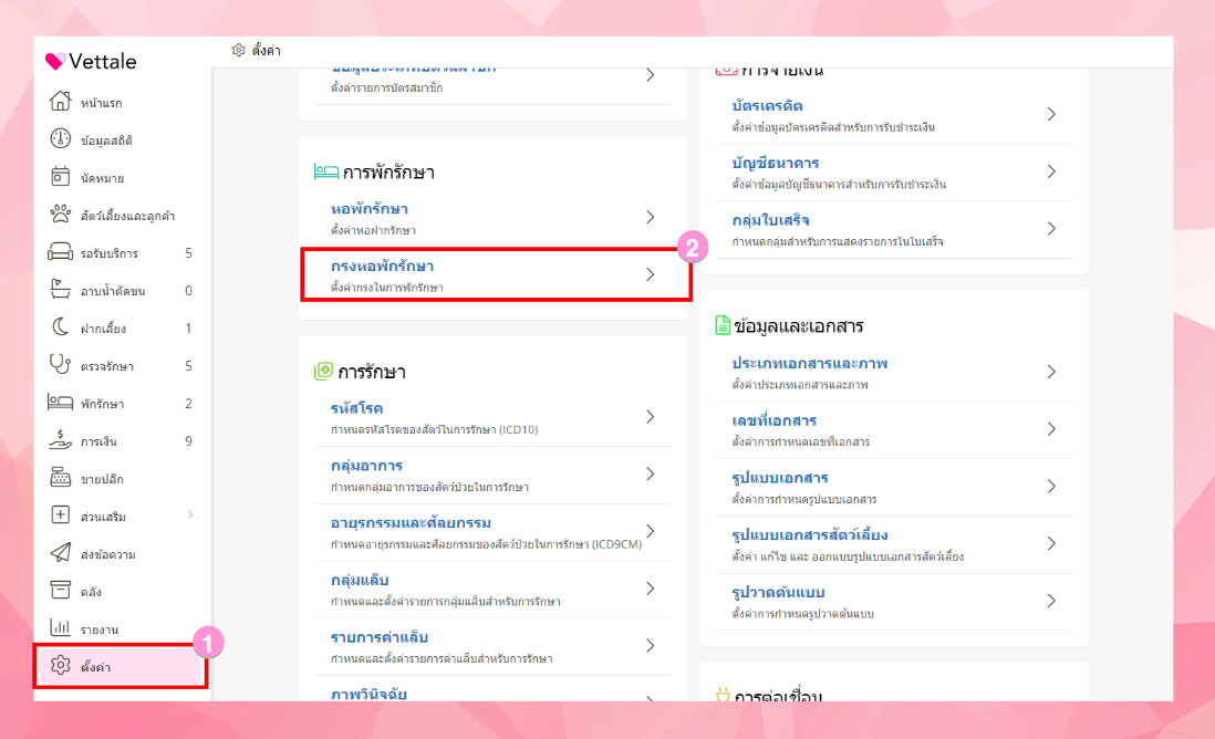 การตั้งค่าข้อมูลกรงหอพักรักษา เป็นการตั้งค่าเพื่อแสดงว่าภายในคลินิคหรือโรงพยาบาลสาขาใดมีกรงหอพักใดบ้าง โดยอ้างอิงจากหอพักรักษาของคลินิคหรือโรงพยาบาลนั้นๆ