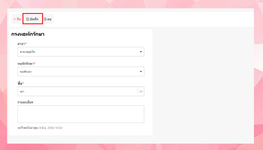 เมื่อผู้ใช้อยู่ในหน้ากรงหอพักรักษา ให้ผู้ใช้เลือกรายการที่ต้องการแก้ไข