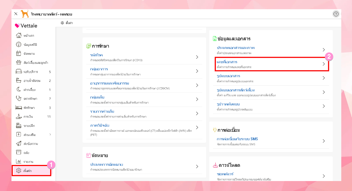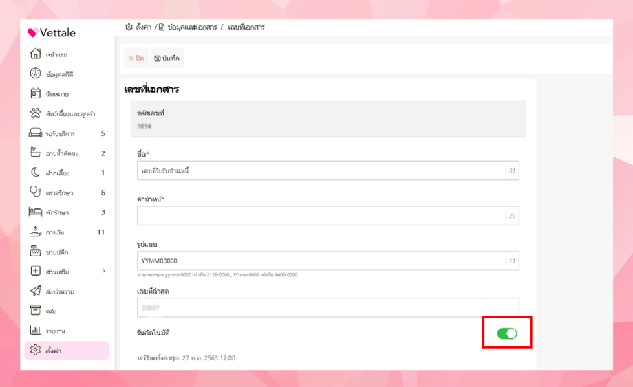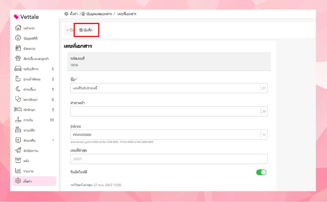 ในระบบการทำงานของ Vettale จะกำหนดให้มีการ บันทึกเลขที่ โดยอัตโนมัติจากการเพิ่มลูกค้าใหม่หรือเพิ่มเอกสารใหม่ หากโรงพยาบาลต้องการกำหนดเลขที่รหัสของลูกค้าเอง หรือ เป็นโรงพยาบาลที่มีระบบเดิมอยู่แล้วและต้องการใช้รหัสเดิม สามารถเปิดระบบ ให้ มีการกรอกเลขที่ได้เอง โดยทำการ ปรับให้เลขที่รหัสเอกสาร ไม่ แสดงอัตโนมัติ โดยตั้งที่