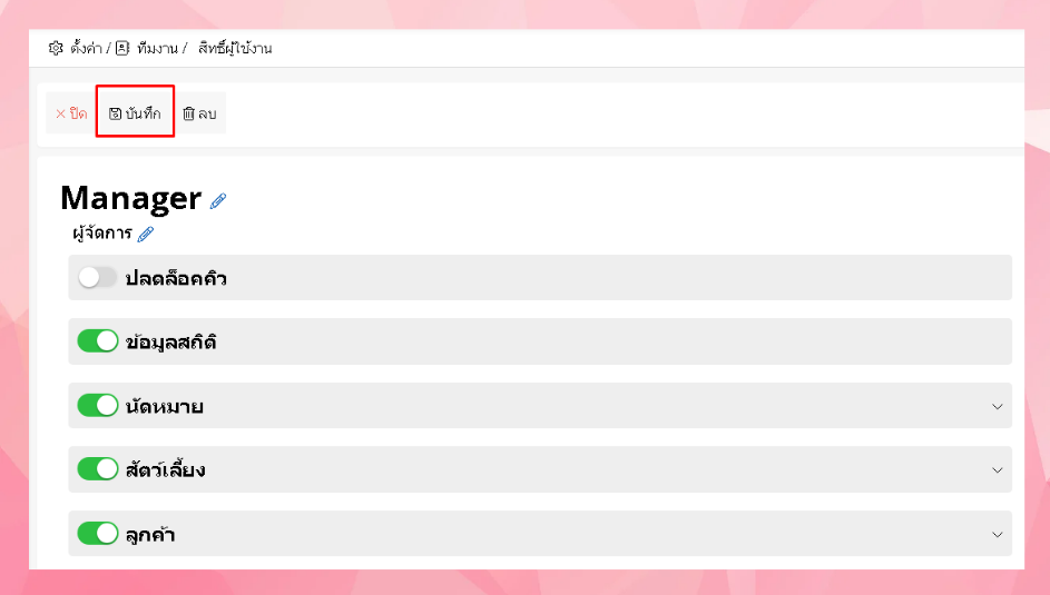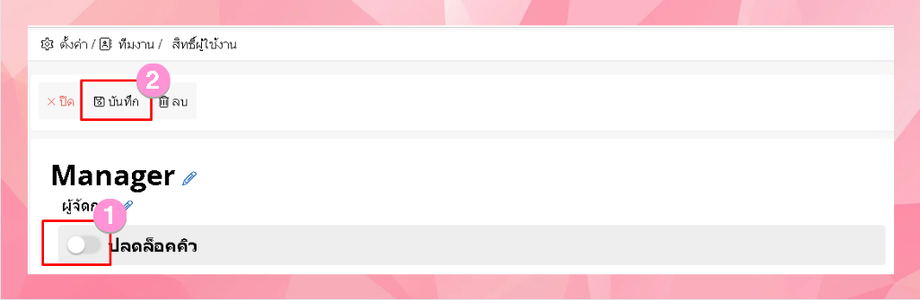 หากผู้ใช้งานไม่สิทธิ์ปลดล็อกคิว สามารถทำได้โดยการ ไปที่ต้งค่า > สิทธิ์ผู้ใช้งาน > เลือกตำแหน่งผู้ใช้งานที่ต้องการเปิดสิทธิ์ปลดล็อกคิว