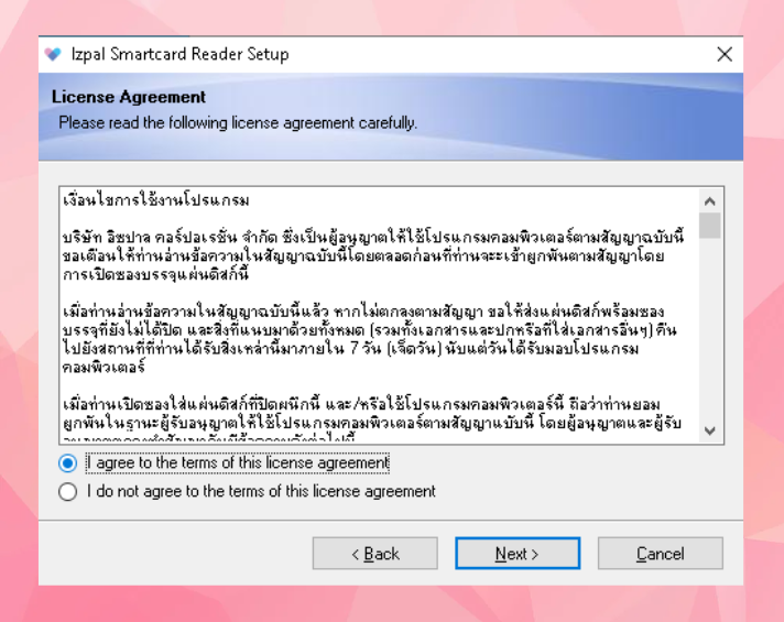 คลิก I agree to the tems of this license agreement > คลิก Next