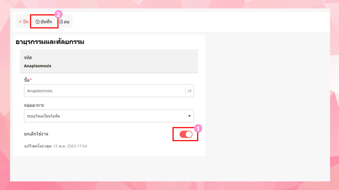 ผู้ใช้งานเลือกเปิดการยกเลิกการใช้งาน (หากยกเลิกแล้วระบบจะไม่ใช้งานข้อมูลที่ยกเลิกไป)