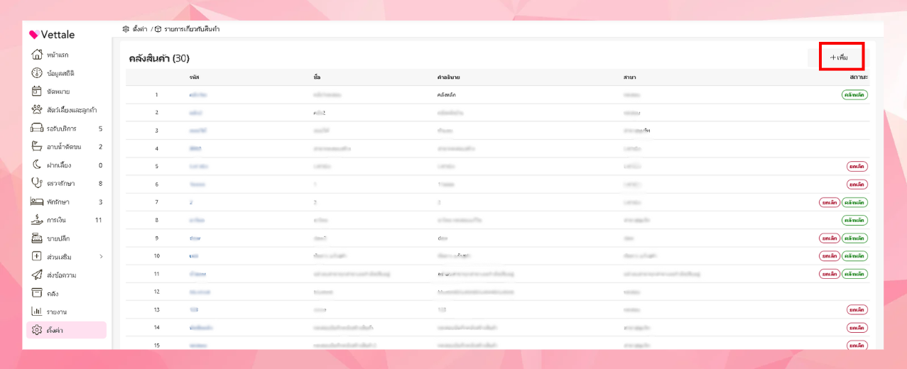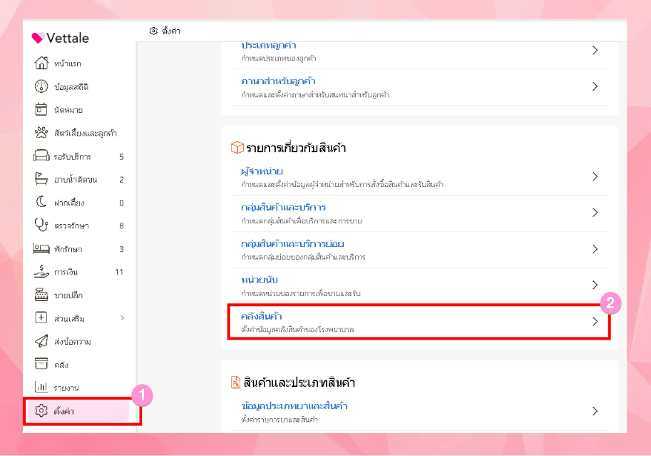 หากผู้ใช้งานต้องการตั้งค่าคลังสินค้า ทำได้โดยการไปที่เมนูตั้งค่า> รายการเกี่ยวกับสินค้า>คลังสินค้า