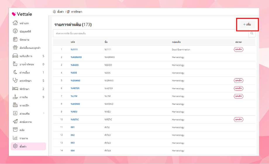 คลิกปุ่ม "เพิ่ม" เพื่อเพิ่มรายการค่าแล็บ