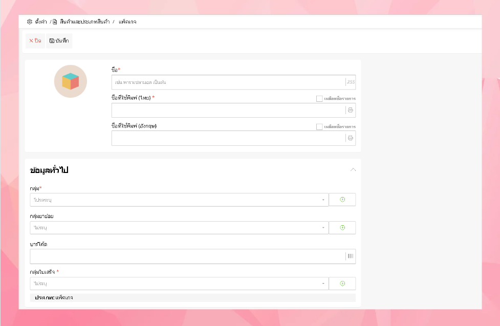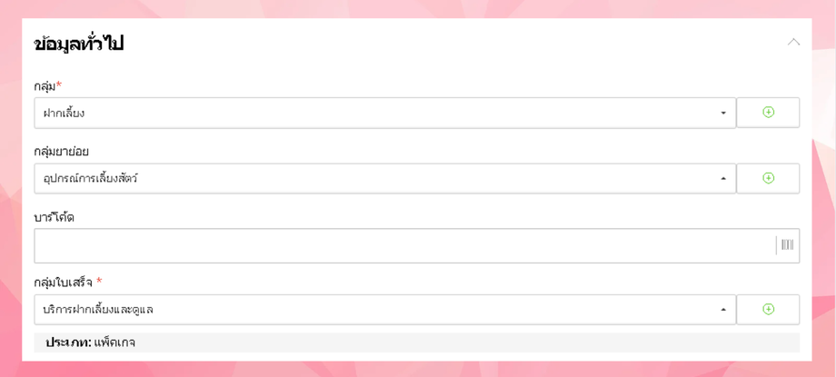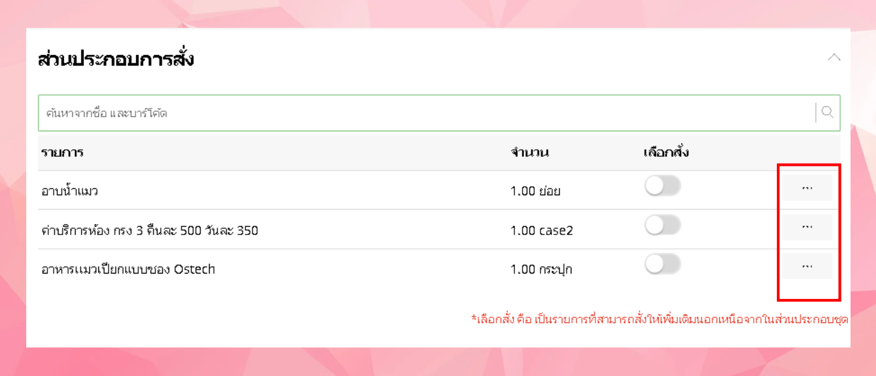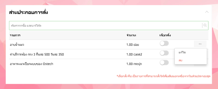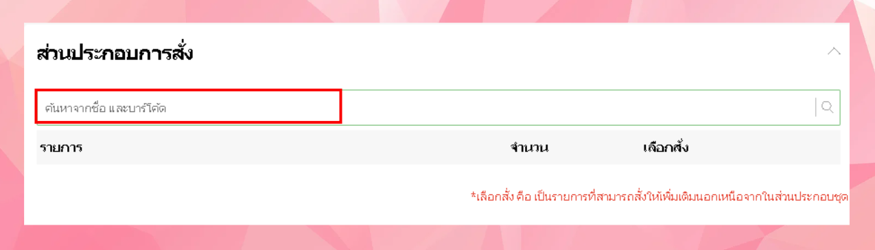 ผู้ใช้งานสามารถเลือกส่วนประกอบของแพ็คเกจได้โดยการค้นหาในช่องค้นหาจากชื่อและบาร์โค้ด