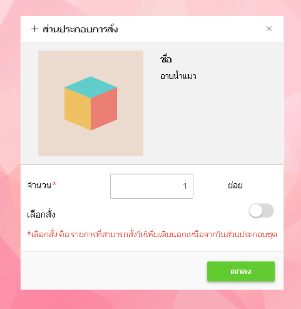 - เมื่อผู้ใช้งานเลือกส่วนประกอบแล้ว ระบบจะแสดงหน้าต่างให้ผู้ใช้กรอกจำนวน