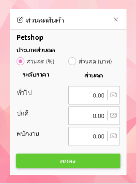 - เมื่อเลือกกลุ่มสินค้าและบริการแล้ว ระบบจะแสดงหน้าต่างส่วนลดสินค้า ผู้ใช้งานสามารถเลือกส่วนลด(%) หรือส่วนลด(บาท) และระดับราคา