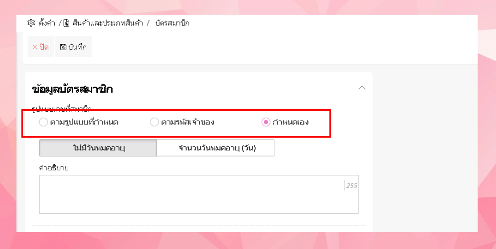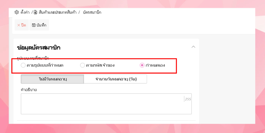 สามารถเลือกรูปแบบบัตรสมาชิกได้ - เช่น ตามรูปแบบที่กำหนด ตามรหัสเจ้าของ หรือกำหนดเอง