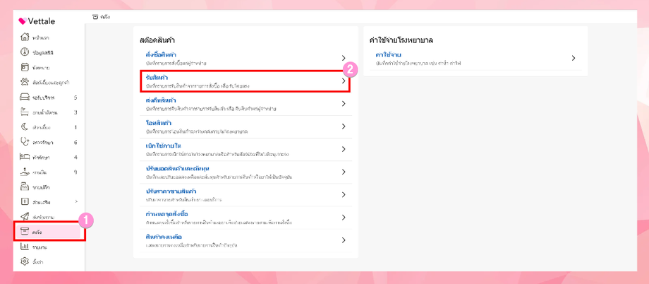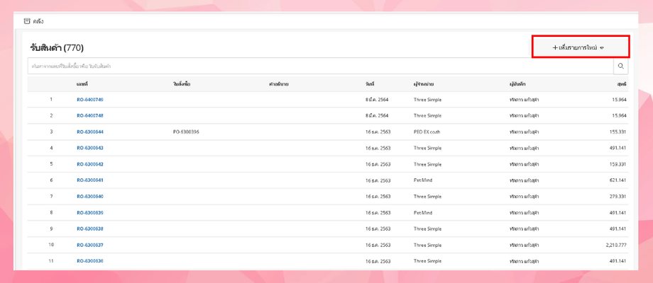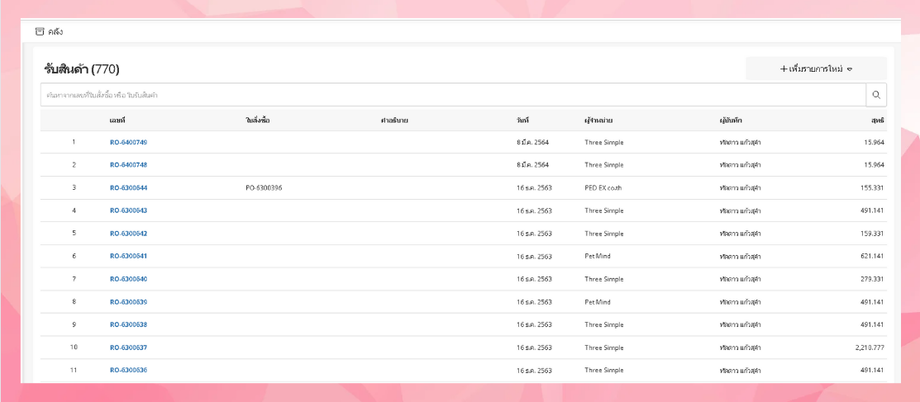 หากผู้ใช้งานต้องการจัดการการรับสินค้า ทำได้โดยการไปที่เมนูคลัง > รับสินค้า