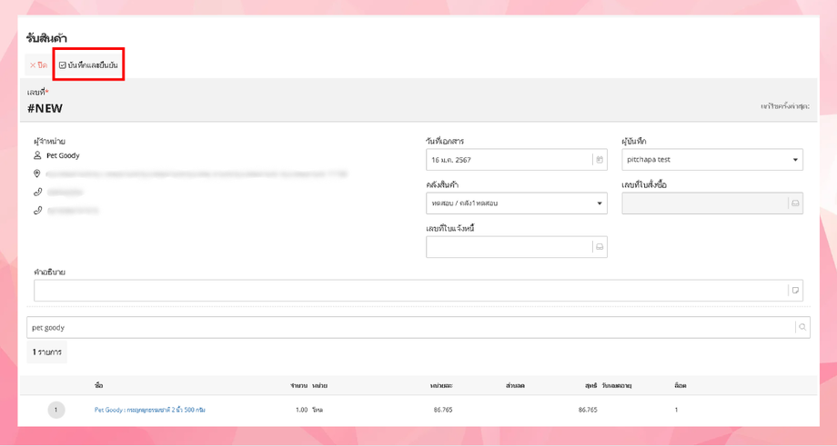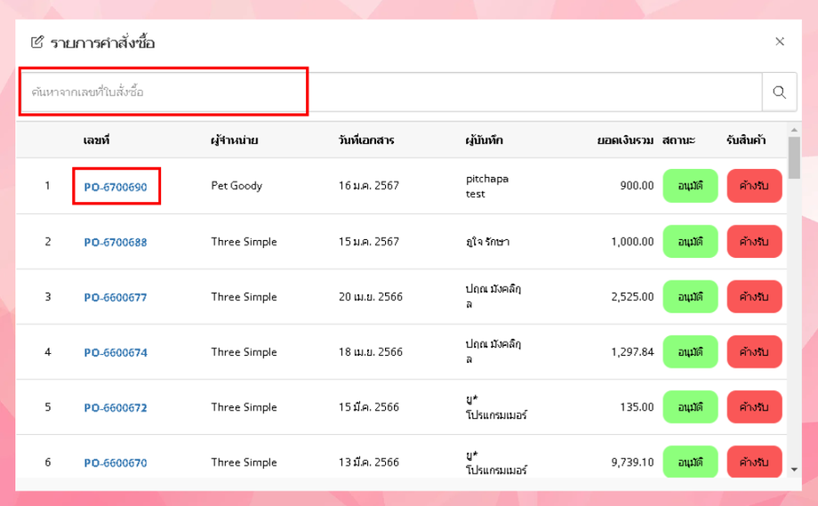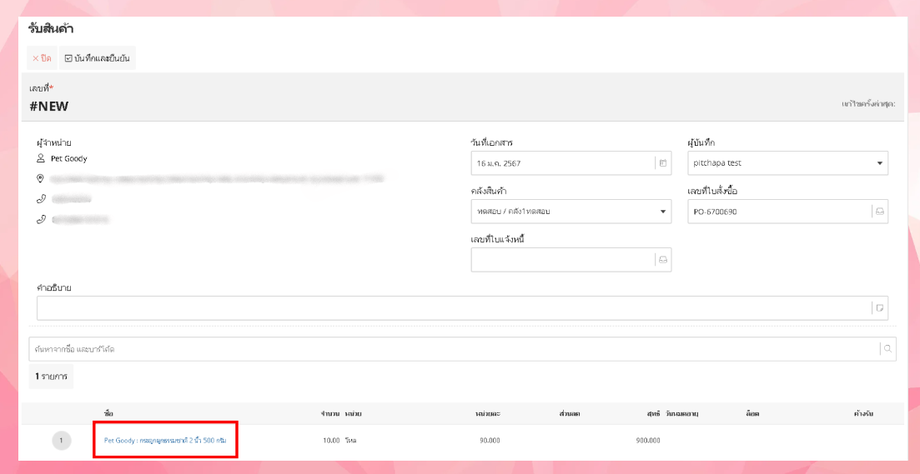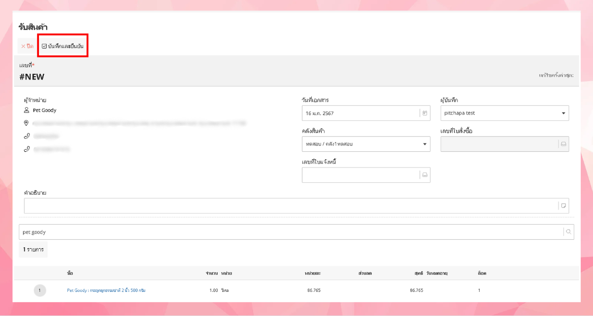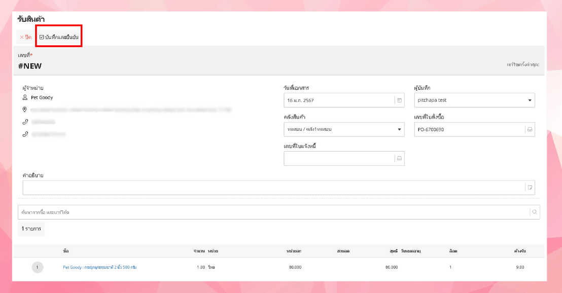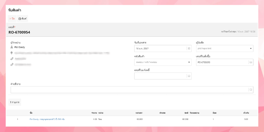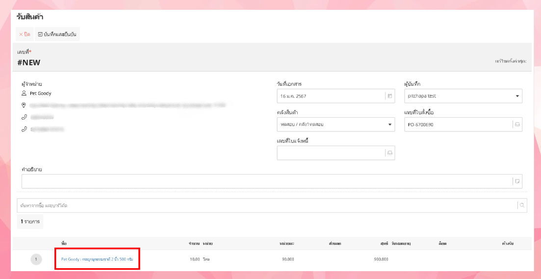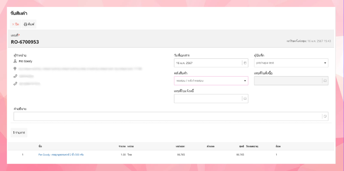 - ระบบจะแสดงใบเลขที่รับสินค้า