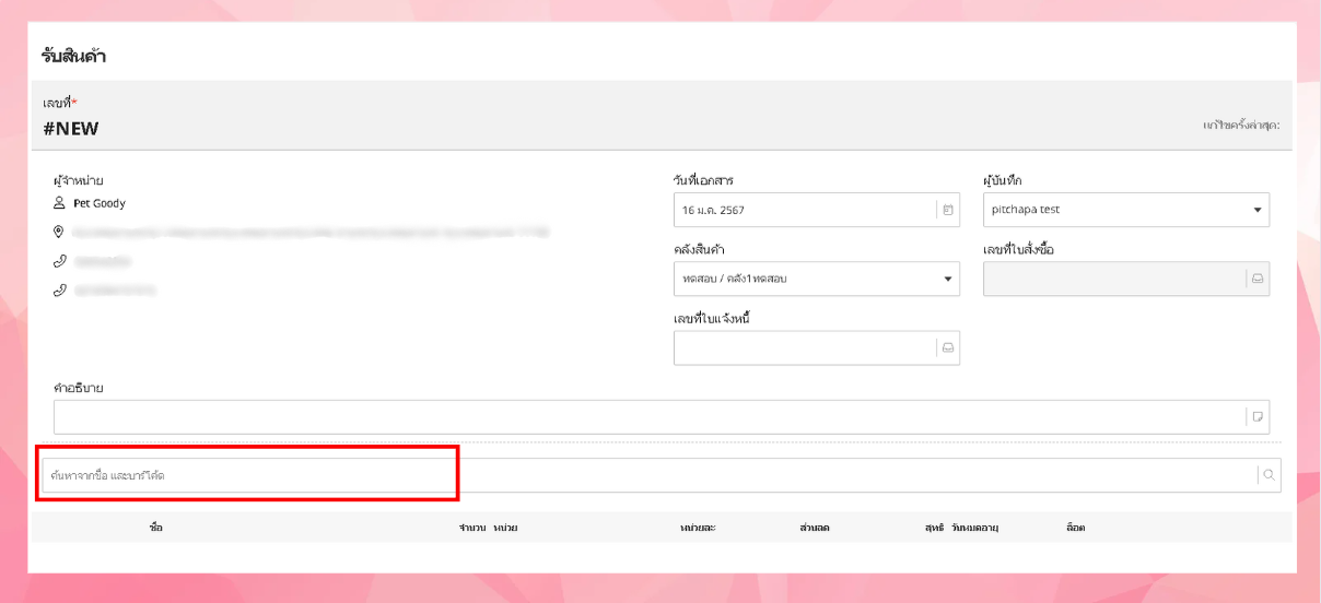 - เมื่อผู้ใช้งานเลือกผู้จำหน่ายแล้ว ระบบจะเข้าสู่หน้ารับสินค้า