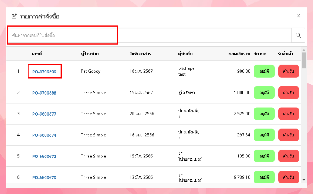 - เมื่อผู้ใช้เลือกรายการรับจากการสั่งซื้อ ระบบจะแสดงหน้าต่างให้ผู้ใช้งานเลือกรายการคำสั่งซื้อ ผู้ใช้งานสามารถค้นหา หรือกดที่เลขที่ใบสั่งซื้อ
