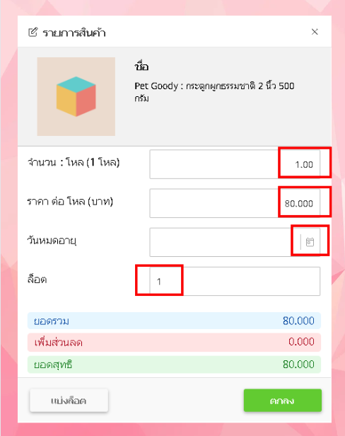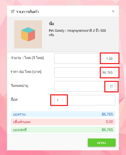 เมื่อกรอกเสร็จแล้วกดปุ่มตกลง - ระบบจะแสดงสินค้า จำนวน ราคา วันหมดอายุ และล๊อต