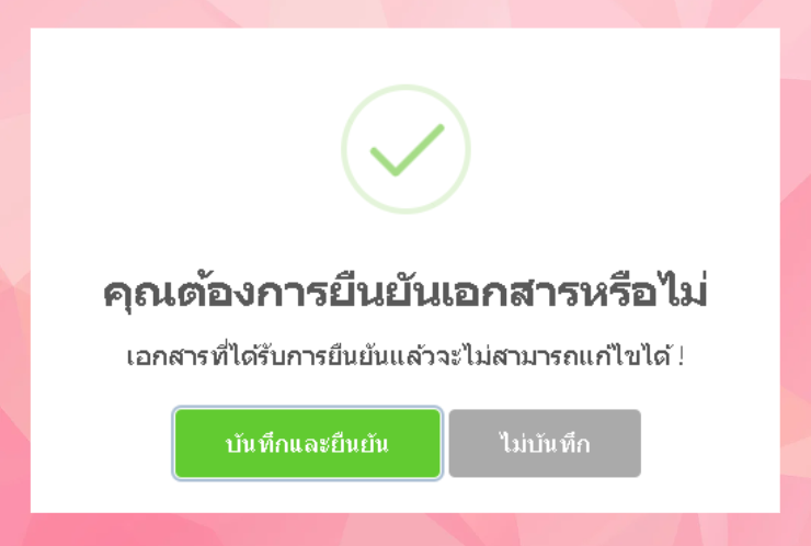 - ระบบจะแสดงหน้าต่างยืนยันเอกสาร ให้ผู้ใช้งานกดปุ่มบันทึกและยืนยัน