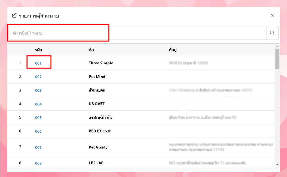 - เมื่อผู้ใช้เลือกรายการเพิ่มจากผู้จำหน่าย ระบบจะแสดงหน้าต่างให้ผู้ใช้งานเลือกรายการผู้จำหน่าย ผู้ใช้งานสามารถค้นหา หรือกดที่รหัสได้