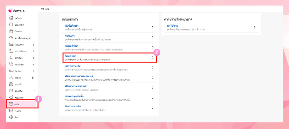 หากผู้ใช้งานต้องการโอนสินค้า ทำได้โดยการไปที่เมนูคลัง > โอนสินค้า