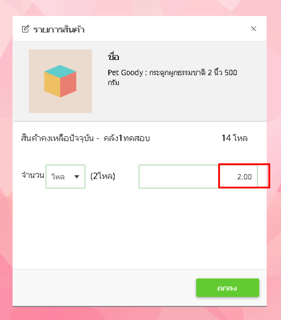 ระบบจะแสดงหน้าต่างสินค้าให้ผู้ใช้งานกรอกจำนวนที่ต้องการโอน และกดปุ่มตกลง