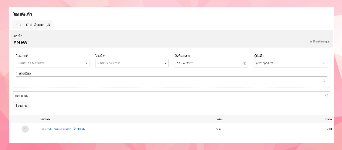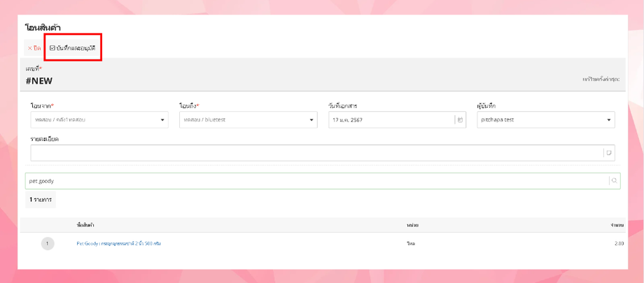 เมื่อผู้ใช้ทำการโอนสินค้าแล้ว กดบันทึกและอนุมัติ