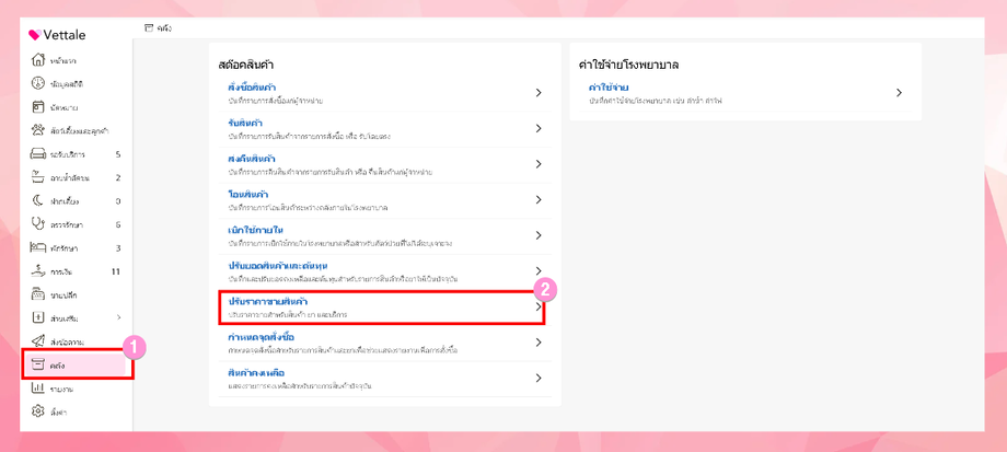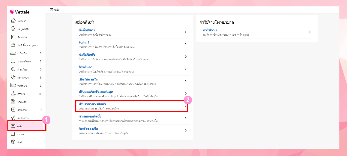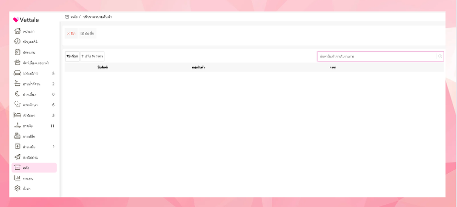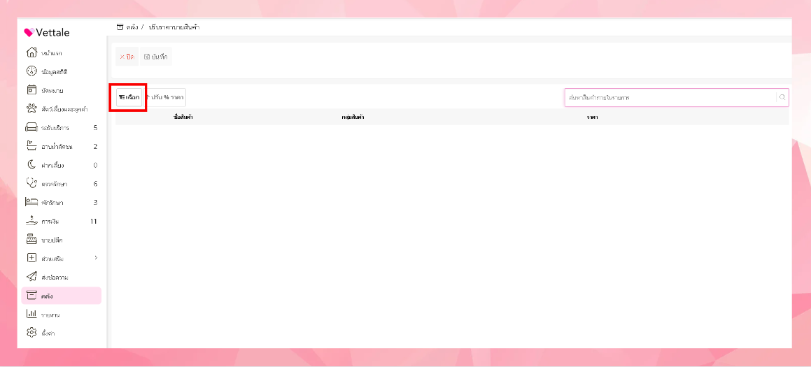 หากผู้ใช้งานต้องการปรับราคาขายสินค้า ทำได้โดยการไปที่เมนูคลัง > ปรับราคาขายสินค้า