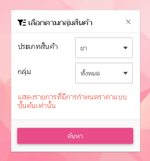 - เมื่อเลือกประเภทสินค้า และกลุ่มแล้ว กดปุ่มค้นหา